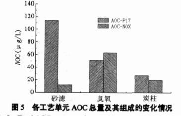 圖5 數據顯示,砂濾出水總AOC 為124μg/L,主要成分是AOC-P17,占91%。經過臭氧工藝,AOC總值變化不大,降為113μg/L,但AOC-NOX 的百分比迅速上升至55%。該現象說明:臭氧并不能大幅度降低水中AOC 值。相反有些實驗結果顯示在臭氧投加量較低的情況下,出水的AOC值會有不同程度的升高。雖然臭氧能將一部分有機物氧化成CO2 和H2O,但總體去除率很低。但臭氧對AOC兩個組分的作用結果卻不一樣。它使AOC-NOX 顯著增加,這是因為臭氧氧化有機物的中間產物多是螺旋菌NOX可利用的物質。而AOC-P17 反而降低,有學者認為可能是部分P17 菌種利用的營養基質被氧化,也可能由于NOX 的營養基質增加,增強了NOX 對這兩種菌種交叉利用的營養物的競爭能力,使得AOC-P17 的值下降。