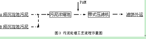 污泥處理系統作為后處理在生物處理系統運行正常后開始運行。調節沉降罐沉淀下來的蛋白全部回收到車間,AB段沉淀池的部分污泥及段沉淀池的污泥進入污泥濃縮池進行濃縮后進入帶式壓濾機壓濾脫水后,泥餅外運填埋,污泥濃縮池的上清液及帶式壓濾機的濾液返回預酸化池進行處理。