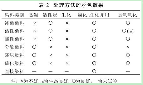 BOD5/CODcr≥0。3的可生化印染廢水經好氧生物處理,均能達標排放。為解決印染廢水的脫色問題,根據美國EPA對不同處理方法的脫色試驗(見表2)表明:染色廢水可采用物化-生化組合工藝進行脫色。為確保脫色效果,在必要時可后加化學氧化法進行脫色。