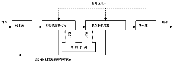 因污水處理站外排水為間斷性排水,為保持后續處理的連續性,要建一個儲水池,儲水池水經水泵提升進入曝氣生物濾池,在此進行進一步的生物處理,曝氣生物濾池出水進入高效精密過濾設備,濾后水進入清水池儲存待用。其工藝流程圖如圖1所示: