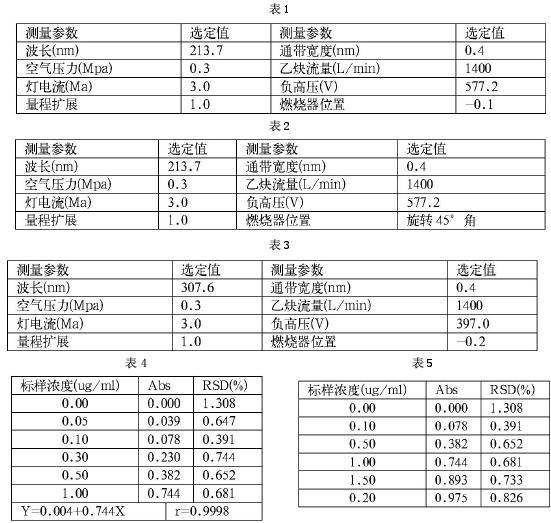 取50mL廢水樣品放入100mL燒杯中,加入硝酸3mL,在電熱板上加熱消解。至5mL左右,加入3mL硝酸和1mL高氯酸,繼續消解,直至近干,取下冷卻,加水溶解,移入50mL容量瓶中,用去離子水稀釋至刻度。用原子吸收測定,同時取0.2硝酸50mL,按上述同樣的程序操作,以此為空白樣。
