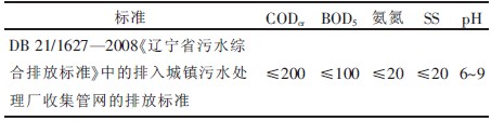本工程處理后的出水排入城鎮管網匯入市政污水處理廠進行再度處理,出水水質要求達到國家排放標準DB 21/1627—2008《遼寧省污水綜合排放標準》中排入城鎮收集管網的排放標準[4],設計出水水質見表1。