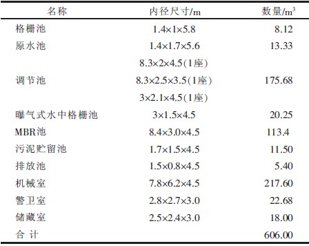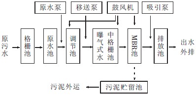 3 工藝流程 工藝流程如圖1所示,廢水經過格柵池、原水池、調節池流進MBR池中進行處理,處理后排水排入市政管網,污泥進行外運。