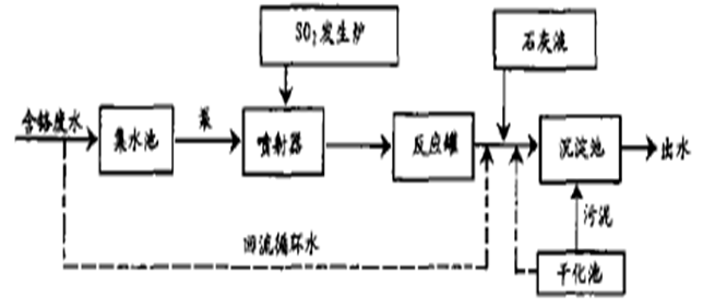 1) 將硫磺燃燒產生的二氧化硫通入廢水中,與水作用生成亞硫酸,廢水中六價鉻被亞硫酸還原為三價鉻,生成硫酸鉻。