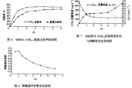 由于乳品廢水本身的特性,在采用傳統(tǒng)好氧工藝處理乳品廢水時(shí),很容易發(fā)生污泥膨脹現(xiàn)象,造成污泥流失,水質(zhì)惡化,嚴(yán)重者會(huì)導(dǎo)致工藝無法正常運(yùn)行. 因此解決污泥膨脹問題對(duì)生物處理廢水是極為重要的. SBR工藝可有效的控制SVI值,從而有效的抑制污泥膨脹. 而SBR池的反應(yīng)時(shí)間的長(zhǎng)短直接影響著水中有機(jī)物和氨氮的降解程度,決定了出水CODcr質(zhì)量濃度和氨氮質(zhì)量濃度的大小.SBR池內(nèi)CODcr、氨氮去除率曲線如圖6 所示. 隨著SBR內(nèi)反應(yīng)時(shí)間的延長(zhǎng), CODcr和氨氮的去除率均逐漸提高,但當(dāng)停留時(shí)間達(dá)到4 h以后,CODcr去除率開始下降,而氨氮的去除率則是沒有太大的升高, CODcr去除率下降是由于曝氣過量,污泥被解體而引起廢水中COD值升高的緣故.SBR池在反應(yīng)過程中有機(jī)物的降解速率,受到供氧速率、污泥質(zhì)量濃度以及有機(jī)物質(zhì)量濃度多方面的影響,氧氣的供應(yīng)是影響有機(jī)物降解速率的一個(gè)重要因素. 因此本試驗(yàn)探討了SBR池內(nèi)CODcr質(zhì)量濃度變化與溶解氧變化關(guān)系如圖7所示.降解速率常數(shù)變化曲線如圖8所示,從圖8可以看出,在開始的兩個(gè)小時(shí)內(nèi),降解速率變化較大,并在1 h時(shí)出現(xiàn)最大值0. 75,即此時(shí)有機(jī)物降解速率最快,在以后4 h逐漸趨于平穩(wěn),則有機(jī)物質(zhì)量濃度的大小影響有機(jī)物降解速率.