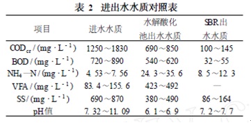通過試驗(yàn),當(dāng)進(jìn)水CODcr質(zhì)量濃度為1250~1830 mg/L時(shí),控制水解酸化池污泥質(zhì)量濃度為6000 mg/L, SBR池污泥質(zhì)量濃度為4000 mg/L,排出比為1∶2,水解酸化時(shí)間6 h和SBR反應(yīng)時(shí)間4 h左右,進(jìn)出水水質(zhì)情況見表2.
