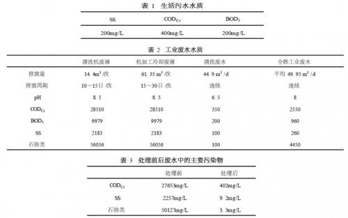 進入廢水處理系統的廢水包括生活污水和工業廢水,生活污水排放量為約63.2m3/d,連續排放。工業廢水包括清洗機廢液、機加工冷卻廢液、清洗廢水,其排放量為約49. 95m3/d。清洗機廢液主要包括清洗機廢液、涂裝清洗廢水等,排放量為14.4 m3/次,排放周期為10~15日/次。機加工冷卻廢液主要是切削廢液排放量為61. 35 m3 /次,排放周期為15~30日/次。清洗廢水主要是地面清洗廢水,排放量為約44. 9 m3 /d,連續排放。為掌握廢水的水質,委托深圳市環境保護監測站對廢水進行水質分析,結果分別見表1和表2。