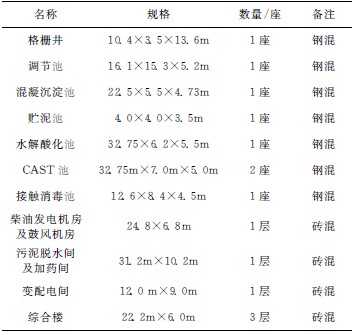 根據工程規模及分期安排,格柵井、調節池、鼓風機房、接觸消毒池和污泥脫水機房按遠期(6 000m3/d)設計,其它構筑物按近期(3 000m3/d)設計。主體構筑物見表3。