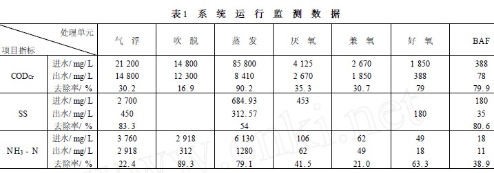 經(jīng)蒸發(fā)、混凝和吹脫預(yù)處理后,高濃度廢水中的 CODCr鹽分和氨氮均大大降低。生化進(jìn)水按CODCr 4 000 mg/ L 、N H3 - N 50~100 mg/ L 設(shè)計(jì)。生化系統(tǒng)采用A2 / O + BAF (厭氧/ 兼氧/ 好氧+ 曝氣生物濾池) 組合工藝。A2 / O 具有較好脫氮效果,BAF 則作為出水的強(qiáng)化處理,保證出水水質(zhì)。工藝流程見圖1 。