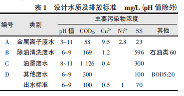根據(jù)該公司生產(chǎn)規(guī)模并考慮沖擊負(fù)荷,污水處理站設(shè)計處理水量為Q=500 m3/d,設(shè)計水質(zhì)及排放標(biāo)準(zhǔn)見表1。