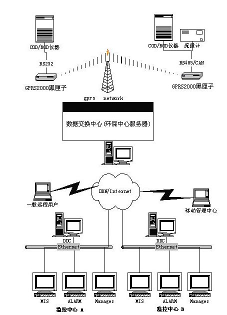 眾所周知,以往在環保數據檢測方面出現了許多的解決方案,其中比較有代表性的基于PSTN電話線和基于GSM短消息傳輸方案。但是在實際使用的過程中,由于電話線傳輸的不穩定性以及容易受環境的影響(雷擊)以致整個系統往往不能正常運行,GSM方案雖然已經解決了環境的影響,但是它天生的數據傳輸吞吐量小,以及數據傳輸時延,不能做到實時在線,也不能滿足環保檢測的需要。基于GPRS無線通訊技術在環保檢測上的應用方案應運而生。