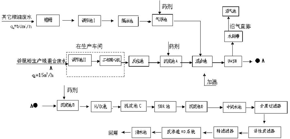 油主要含在糧油廢水中。糧油廢水可生化性極好,作為高濃度谷朊粉廠生產廢水的稀釋水是可行的。問題是要在作為稀釋水前,進行予處理,去除水中浮油、乳化油及溶介性油。工程實踐證明,在糧油廢水進入生化處理前,進行隔油,化學破乳,用隔油器、沉降池及氣浮器可將絕大部份浮油、乳化油去除掉(相應CODcr可去除75%左右,SS可去除94%,油去除97%),經予處理后糧油廢水可以作為谷朊粉廠廢水的稀釋水,至于糧油廢水中的溶介性油可在后續生化處理裝置一并去除掉。