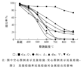 還原焙燒時,電鍍污泥與還原劑煤粉混勻,裝于加蓋瓷坩堝內,置于馬弗爐中在設定溫度下焙燒一定時間,底渣于干燥器中冷卻備用。直接焙燒則是不加煤粉,在坩堝中敞口焙燒。