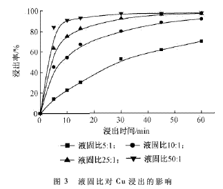 以10%的硫酸溶液為浸出劑,按不同的液固比在室溫下以112r/min浸出。Cu的浸出率變化如圖3所示。
