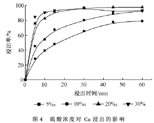 由圖4可見:當硫酸濃度在5%~20%時,隨著硫酸濃度的增大,浸出率不斷增大。但是當以30%硫酸溶液為浸出劑浸出30min后,浸出率開始下降。雖然20%的硫酸溶液對Cu的浸出率略大于10%的硫酸溶液,但是增大硫酸濃度的同時也易造成雜質金屬的浸出,并且不利于后續萃取。因此,適宜采用10%的硫酸濃度。