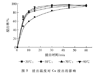 由圖5所示:浸出溫度對Cu的浸出影響較小。當浸出溫度為30℃,浸出時間為60min時,Cu的浸出率已達94.09%,繼續升溫,Cu浸出率升高不明顯。因此,選擇常溫下浸出即可。
