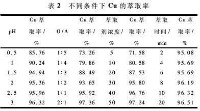 以浸出液為萃取料液,其中主要含Cu8.67g/L,Ni0.43g/L,Zn1.57g/L,pH為1.0。料液不經除雜直接由LIX973—磺化煤油體系萃取Cu。實驗研究了料液pH值、相比(有機相對水相的體積比,記作O/A)、萃取劑濃度(萃取劑占有機相的體積分數)、萃取時間等因素對Cu萃取率的影響。經實驗確定反應基準條件為:pH值為2,O/A為1∶1,萃取劑濃度30%,萃取時間為6min。在單因素實驗時,除改變實驗因素的條件外,其他條件同基準條件。結果見表2。