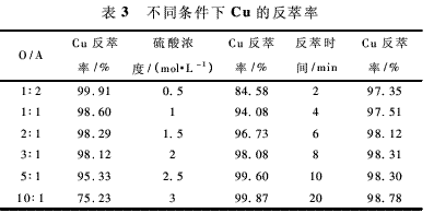 經萃取后的負載有機相中Cu含量為7.94g/L,以此作為反萃料液。反萃實驗基準條件為:O/A為3∶1,硫酸濃度2mol/L,反萃時間為6min。結果見表3。