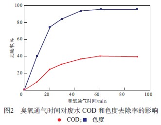 2.1 臭氧通氣時間對廢水 COD 和色度去除率的影響