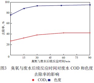 2.2 臭氧與廢水后續反應時間對廢水 COD 和色度去除率的影響