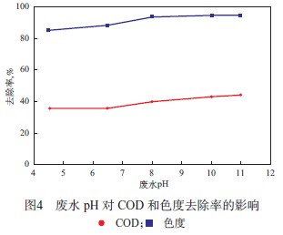 2.3 廢水 pH 對 COD 和色度去除率的影響