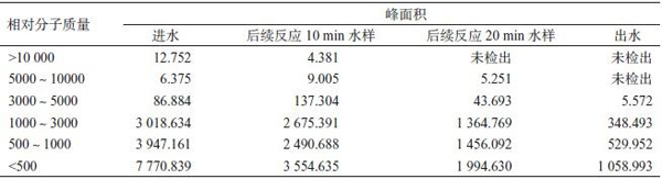采用凝膠色譜法測定的廢水 DOM 各相對分子質量區間對應的峰面積見表 1。峰面積是峰高與保留時間的積分值。由表 1 可見:進水中含有一定量的相對分子質量大于 10 000 的 DOM;后續反應10 min 時,相對分子質量大于 10 000 的 DOM 的峰面積減小,而相對分子質量為 3 000~10 000 的DOM 的峰面積增大;后續反應 20 min 時,廢水中已經不存在相對分子質量大于 10 000 的 DOM,相對分子質量為 3 000~10 000 的 DOM 的峰面積也明顯變小;出水中 DOM 的相對分子質量都在5 000以下,且大部分小于 3 000。說明臭氧氧化可將廢水中相對分子質量較大的物質降解為相對分子質量較小的物質。具體參見http://www.bnynw.com更多相關技術文檔。