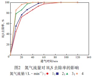 在油田廢水含油量為 200 mg/L、廢水 pH 為5.5、水浴溫度為45 ℃的條件下,氮氣流量對 H2S去除率的影響見圖 2。由圖2 可見,隨氮氣流量增大,H2S 去除率升高。因為氮氣流量較小時,H2S 在氮氣中的分壓和在廢水中的分壓很快達到平衡,故不能將大量的 H2S 帶走;隨著氮氣流量增加,氮氣可帶走更多的 H2S ,氮氣和廢水的接觸面積也增大,H2S 向氮氣中擴散的速率增加,故 H2S去除率升高。由圖 2 可見,氮氣流量為 3 L/min 和4 L/min 時,30 min 內廢水中的 H2S 去除率均達到98% 以上。綜合考慮,本實驗最佳氮氣流量為 3L/min,通氣時間為 30 min。