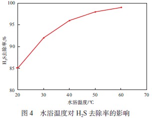 在油田廢水含油量為 200 mg/L、油田廢水 pH為 5 .0、氮氣流量為 3 L/min、通氣時間為 30 min 的條件下,水浴溫度對 H2S 去除率的影響見圖 4。由圖 4 可見:隨著水浴溫度提高,H2S 去除率升高,因為水浴溫度升高時 H2S 的溶解度變小,H2S 更易從廢水中析出,隨氮氣排出;當水浴溫度為45 ℃時,H2S 去除率已達 97%;繼續提高水浴溫度,H2S去除率升高趨緩。綜合考慮,本實驗最佳水浴溫度為45 ℃。