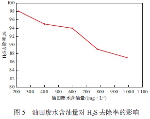 由圖5可見,隨著油田廢水含油量的增加,H2S 去除率逐漸下降。因為廢水中的油類物質會阻礙 H2S 從廢水中析出,減小 H2S 向氮氣中擴散的速率。