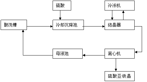 (3)30℃的廢酸液泵入結(jié)晶器中,加冷凍鹽水冷卻至5℃,間歇操作,繼續(xù)降低硫酸亞鐵的溶解度;