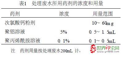 (2) 通過(guò)本試驗(yàn), 篩選出3種藥劑的適宜用量(按處理1L 廢水計(jì)) 為: 次氯酸鈣(固體粉劑)150mg、5% 的聚鋁溶液5. 5mL、0. 1% 的聚丙烯酰胺溶液2mL。