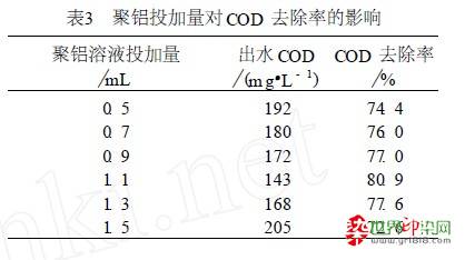 由表3可見(jiàn), 隨著聚鋁投加量的增加, COD去除率呈上升趨勢(shì), 當(dāng)聚鋁溶液投加量為1. 1mL 時(shí), COD 去除率升至最高; 繼續(xù)增加聚鋁投加量, COD 去除率反而下降。此時(shí)定性檢測(cè)廢水中的固體顆粒呈正電性, 說(shuō)明聚鋁用量過(guò)多, 使廢水中固體顆粒的電性發(fā)生了變化。聚鋁溶液的適宜用量為1. 1mL。