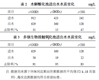 經過多方調查和小試的基礎上,最后選擇水解酸化-多級接觸氧化工藝為主體工藝,工程完工后,進行了3 個多月的調試運行。