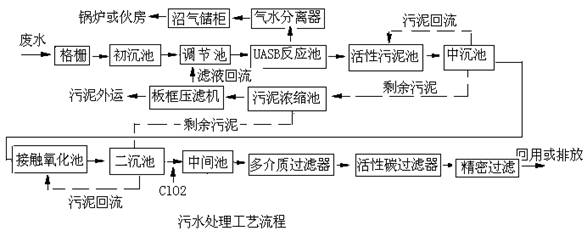 生物處理工藝包括好氧工藝和厭氧工藝。好氧工藝具有運行穩定、去除率高、出水水質好等特點,適合低濃度有機廢水的處理,對于高濃度廢水及含有很多復雜有機物的廢水,單純采用好氧工藝很不經濟,而且有些有機物對好氧菌來說是難生物降解或不能降解的,但這些有機物往往可以通過厭氧菌分解為較小分子的有機物,而那些較小分子有機物可以通過好氧菌進一步分解。厭氧工藝具有負荷高、能耗小、產泥量少、土建投資省等特點,適宜處理高濃度廢水。但用厭氧工藝處理高濃度廢水時,需要加好氧生物處理,才能保證出水效果。所以采用厭氧+好氧組合生物工藝是處理該廢水的一種最佳結合。