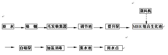 1、小區(qū)生活污水(含廚房用水等)經過收集管路進入污水處理站,經隔柵過濾,去除大顆粒的泥沙、雜質和生活垃圾后進入沉砂調節(jié)池。進入調節(jié)池之前,先經過毛發(fā)收集器,去除大量的纖維狀懸浮物。調節(jié)池內的清水進入一體式生化池,其中缺氧生化區(qū)用于降解大分子有機物和反硝化作用,消除NH3-N。膜-生物反應器池部分為好氧生化池。經過生化處理和膜過濾的水,進入加藥消毒池,加氯消毒,而后進入集水池,再用水泵輸送到用水點。為了去除水中的NH3-N,好氧生化區(qū)的污泥大比例回流到缺氧生化區(qū)。
