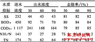 b.A段兼性反硝化反應器中傳質攪拌器的設置可提高兼性反硝化反應器的工作效率,促進有機物降解和反硝化脫N過程的進行。在傳質攪拌器的作用下,反應器內主要由兼性反硝化菌組成的生物絮體因水力和機械切割作用而破碎,絮體比表面積增大,與進水及硝化區回流液接觸充分,可提高生物絮體與污染成分之間的傳質效率,進而改善了兼性反硝化反應器的工作性能。試驗結果表明,傳質攪拌器的轉速以60r/min為宜,在此條件下,系統脫N率可達64%以上。轉速過低時,強化傳質作用不顯著;超過90r/min時,TN的去除率反而降低,初步分析是由于生物絮體過于破碎,沉降性能較差,反硝化區泥水分離效果較差,使系統的工作效率下降。