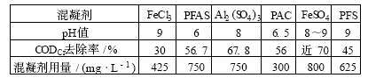 根據表1,綜合考慮CODCr去除率及價格因素后,選擇FeSO4 混凝劑,生產中用CaO調節pH值至8,混凝劑FeSO4 投加量一般為600~800 mg/L。