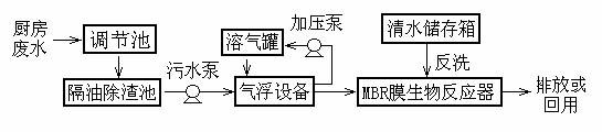 在本方案中污水處理設備,為氣浮+膜-生物反應器(Membrane Bioreactor,簡稱MBR)工藝,本工藝中的核心部分MBR是生物處理技術與膜分離技術相結合的一種新工藝,取代了傳統工藝中的二沉淀,它即可以高效地進行固液分離,得到直接使用的穩定中水,又可在生物池內維持高濃度的微生物量,工藝剩余污泥少,極有效地去除氨氮,出水懸浮物和濁度接近于零,出水中細菌和病毒被大幅度去除,能耗低,占地面積小,操作管理方便,出水可直接回用等特點,特別受到工業發達、人口面積、水資源缺乏的地區歡迎。具體參見http://www.bnynw.com更多相關技術文檔。