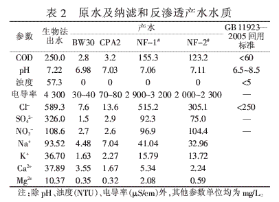 表2為常溫下納濾(1.4 MPa)和反滲透(2.8 MPa)運行6 h后的產水水質。