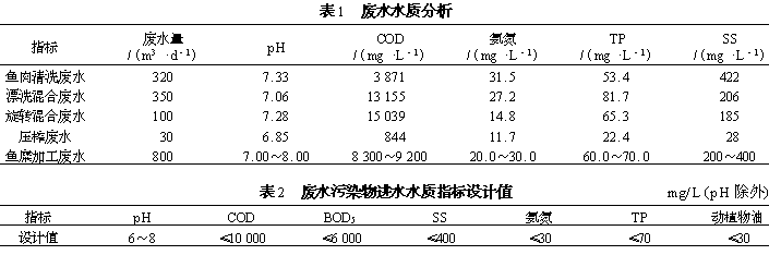 企業日排放魚糜加工廢水約800 m3 ,包括魚肉清洗廢水、漂洗混合廢水、旋轉混合廢水和壓榨廢水。廢水水質分析見表1 ,廢水污染物進水水質指標設計值見表2。