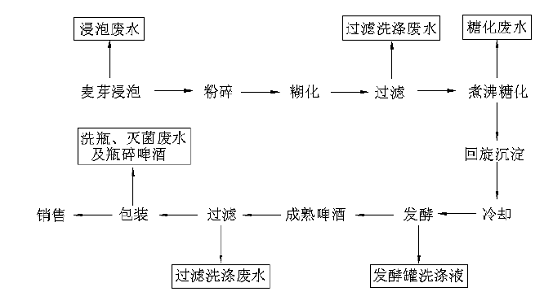 由圖中可以看出,污水主要來源有:麥芽生產(chǎn)過程的洗麥水、浸麥水、發(fā)芽降溫噴霧水、麥槽水、洗滌水、凝固物洗滌水;糖化過程的糖化、過濾洗滌水;發(fā)酵過程的發(fā)酵罐洗滌、過濾洗滌水;罐裝過程洗瓶、滅菌及破瓶啤酒;冷卻水和成品車間洗滌水;以及工廠員工的生活用水等等。