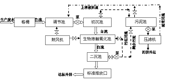 物化污泥及生化剩余污泥排向污泥濃縮池,濃縮池上清液自流入調節池,濃縮污泥經泵壓入污泥壓濾機進行脫水處理,濾液回流至調節池,泥餅外運處理;