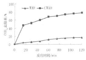 為考察CuO-MnO2-CeO2 /γ- Al2O3催化劑對蘭炭廢水的催化活性,我們對比了濕式氧化和催化濕式氧化處理蘭炭廢水的效果。在反應溫度為150℃,氧分壓為1. 6MPa,進水pH = 8,催化劑投加量為10g/L的條件下反應,結果如圖2所示。