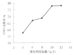 從圖6可以看出,隨著催化劑投加量的增大,CODcr去除率逐漸增大,當投加量大于10g /L 時,CODcr去除率趨于穩定,過多的催化劑則會造成資源浪費,增加處理成本,因此選擇最佳催化劑投加量為10g/L。