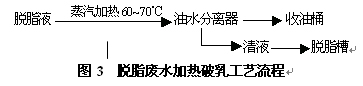 工件脫脂的含油廢水在線用蒸汽加熱至60~70℃,利用蒸氣加熱破壞脫脂油槽中油類在水中的乳化體系,即加熱破乳。蒸氣加熱時產生的微小氣泡上升的浮力將油浮選出來。浮選出來的油通過油水分離器將油收集到油箱中,下部凈化過的脫脂液回到脫脂槽。經該裝置處理過的脫脂液,油水分離效率達到70%~80%,脫脂槽中含油在40 mg/L以下,去除率達88%,CODCr去除率達85%(見表2),從而保證了后續廢水的正常處理。脫脂流程見圖3。