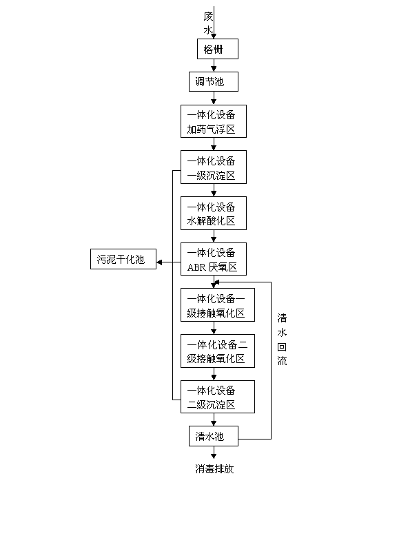 來(lái)自工廠的廢水經(jīng)排污溝自流進(jìn)入調(diào)節(jié)池,在排污溝中設(shè)置粗細(xì)各一個(gè)格柵,然后廢水經(jīng)提升泵提升到一體化設(shè)備中的配水系統(tǒng),然后廢水進(jìn)入加藥氣浮區(qū),后進(jìn)入水解區(qū),經(jīng)水解酸化處理后的廢水自流進(jìn)入折流板厭氧區(qū),并在該處對(duì)原水進(jìn)行必要的稀釋,出水進(jìn)入接觸氧化區(qū),經(jīng)過(guò)好氧曝氣反應(yīng)后,到沉淀區(qū)進(jìn)行污泥沉淀后排放。工藝流程圖如下: