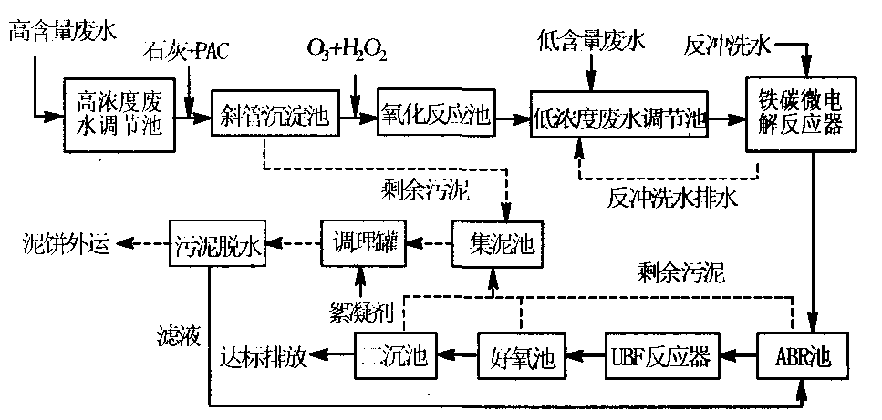 高濃度化學制藥廢水排出后進入高濃度化學制藥廢水調節池,出水加入石灰和PAC后進入斜管沉淀池進行固液分離,沉淀出水加入O√HO后在氧化池中反應,反應后與低濃度廢水進入低濃廢水凋節池,然后經泵送至鐵碳微電解反應器反應,出水進入ABR池水解酸化后進入UBF反應器進行中溫厭氧反應,反應后出水進入好氧池進行反應,出水經過二沉池沉淀后排放。