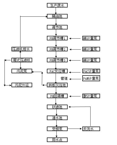 斜板沉淀池出水自流進行pH回調,以確保合格水PH值在6~9間,由計量泵自動投加。終端監測罐內合格水經砂濾池過濾后自流入清水池不合格水回原水池。具體參見http://www.bnynw.com更多相關技術文檔。