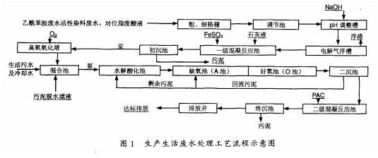 活性染料廢水、乙酰苯胺廢水、對位脂廢酸液及生活污水、設備冷卻水排水的處理工藝流程見圖1。