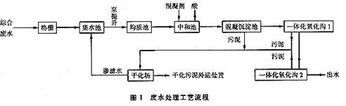 物化法和生化法聯合使用是處理印染廢水常規的典型工藝。混凝沉淀具有脫色和去除懸浮物能力強的特點,同時所投加的混凝劑也可以起到一定的調節pH作用。生化法對溶解性的有機物去除能力強。由于廢水中的主要污染物在pH為6~9條件下為難溶性的對苯二甲酸和各種分散染料等,因此綜合廢水先經混凝沉淀,可有效地去除有機污染物、色度和調節pH值,并提高廢水的生化性能,為后續生化處理創造有利條件。生化法采用氧化溝工藝,適用于該印染廢水水質特點和對出水水質高的要求。